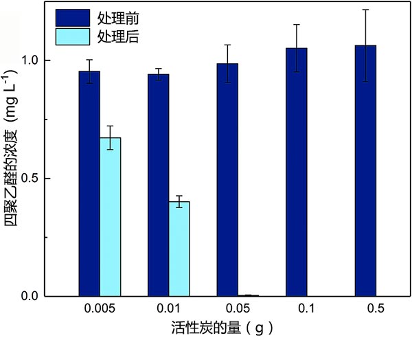 圖2顯示了在不調(diào)節(jié)單一體系中的聚乙醛溶液的pH的情況下處理前后的四聚乙醛濃度。可以看出,有效地除去了聚乙醛,特別是在活性炭劑量較高的情況下。單因素統(tǒng)計(jì)檢驗(yàn)證實(shí),在活性炭處理2小時(shí)之前和之后,乙醛濃度之間存在顯著差異(p<0.05)。當(dāng)活性炭用量從0.005g增加到0.05g時(shí),去除甲醛的百分比從30.3%增加到99.6%。當(dāng)PAC用量高于0.05 g時(shí),處理后未檢測(cè)到乙醛,表明其濃度低于檢測(cè)到的聚乙醛(1~5μgL-1)。