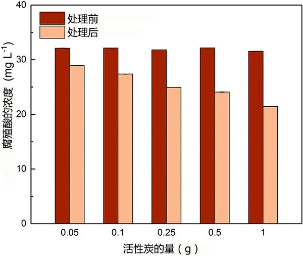 圖3顯示了不同劑量的活性炭處理之前和之后的HA濃度。通過(guò)在活性炭上吸附適度除去HA。隨著活性炭劑量的增加,HA的去除百分比范圍為9.8%至32%。雖然處理前HA的初始濃度(C 0=30 mg L-1)遠(yuǎn)高于聚乙醛(C 0=1 mg L-1),但高劑量的活性炭(例如1g)在2小時(shí)內(nèi)也只能去除32%的HA。