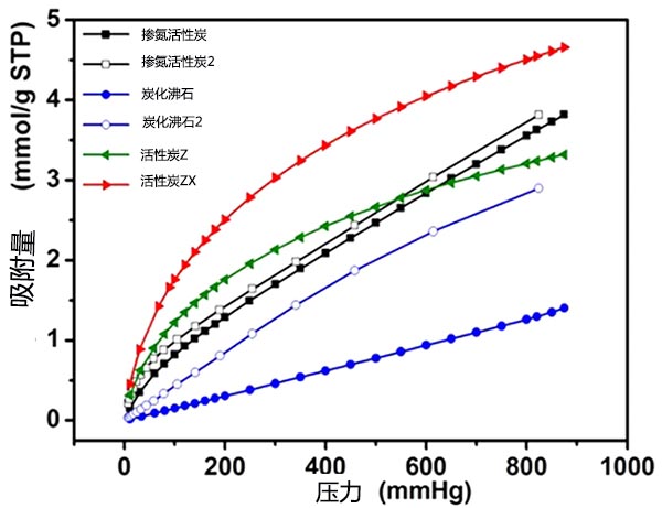 圖3顯示炭化沸石對(duì)CO 2和N 2的吸附比較低。值得注意的是, 與其他相比,摻氮活性炭在 p > 0.5 bar時(shí)顯示出較高的CO 2吸附,這主要?dú)w因于四極CO 2分子與不飽和金屬位點(diǎn)中的正電荷之間的相互作用。此外,除摻氮活性炭外,還包括CO2和N 2吸附容量遵循活性炭Z>活性炭ZX>炭化沸石的順序,這意味著這些前體生產(chǎn)的氮摻雜活性炭具有顯著的氣體吸附性能。