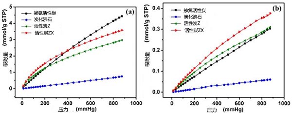 圖3、幾種活性炭樣品上的氣體的實(shí)驗(yàn)吸附等溫線,(a)CO 2,(b)N 2。
