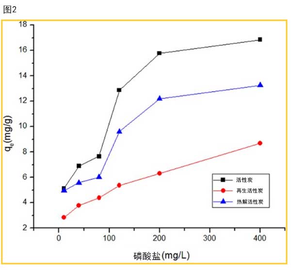 為了評(píng)估再生活性炭的性能,研究了磷的吸附性能。在該研究中,通過(guò)改變磷酸鹽的初始濃度(20℃)來(lái)測(cè)試活性炭,再生活性炭和它的吸附容量。圖2顯示了一般趨勢(shì),即吸附容量隨初始P濃度的增加而增加,直至達(dá)到飽和狀態(tài)。