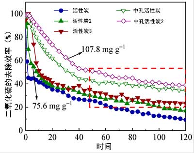圖2.活性炭和中孔活性炭樣品的SO 2去除效率與時(shí)間的關(guān)系。