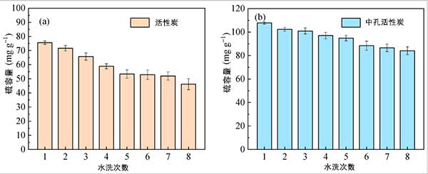 為了比較水洗再生對脫硫后活性炭樣品的影響,研究了硫容量與活性炭和中孔活性炭的循環(huán)次數(shù),如圖3所示。活性炭的工作硫容量總體呈下降趨勢,第一次脫硫時(shí)為75.6 mg·g-1,第8次循環(huán)為46.2 mg·g-1,減少率為40.5%,如下圖所示。圖3a。結(jié)果表明,飽和吸附劑對H 2 SO 4的不完全解吸對循環(huán)SO 2有明顯的負(fù)面影響活性炭的吸附性能。用中孔活性炭觀察到類似的結(jié)果。然而,中孔活性炭的硫容量在8個(gè)循環(huán)后降低了22.0%,遠(yuǎn)低于微孔活性炭的降低速率,這表明互連微孔和有序介孔的特性促進(jìn)了H的解吸。2 SO 4并減少硫容量的減少。