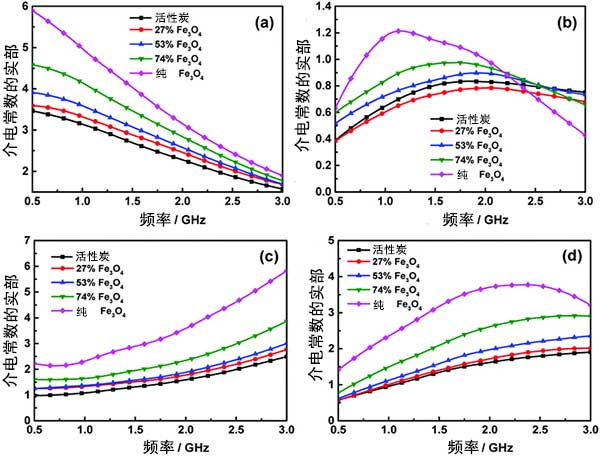 此外,研究了活性炭復(fù)合材料的電磁波吸收性能。圖4顯示復(fù)介電常數(shù)和導(dǎo)磁率,這些電磁參數(shù)對于確定微波吸收復(fù)合材料的介電和磁損耗非常重要,并且在吸收過程中電磁波的傳輸和反射也受它們的影響。從圖6(a)和(b)中,可以觀察到,所有樣品的介電常數(shù)的實(shí)部與增加頻率。圖6(c)和(d)顯示了磁導(dǎo)率的實(shí)部和虛部作為頻率的函數(shù)。觀察到當(dāng)活性炭的負(fù)載量低時,滲透率的實(shí)部僅略微增加。