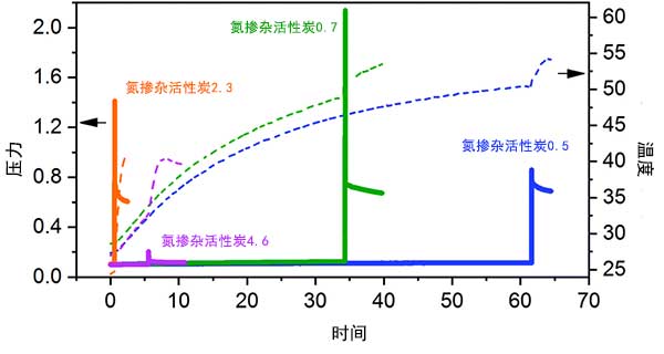 圖2: 不同質(zhì)量的氮摻雜活性炭機(jī)械化學(xué)合成的溫度(虛線)和壓力(實(shí)線)曲線。