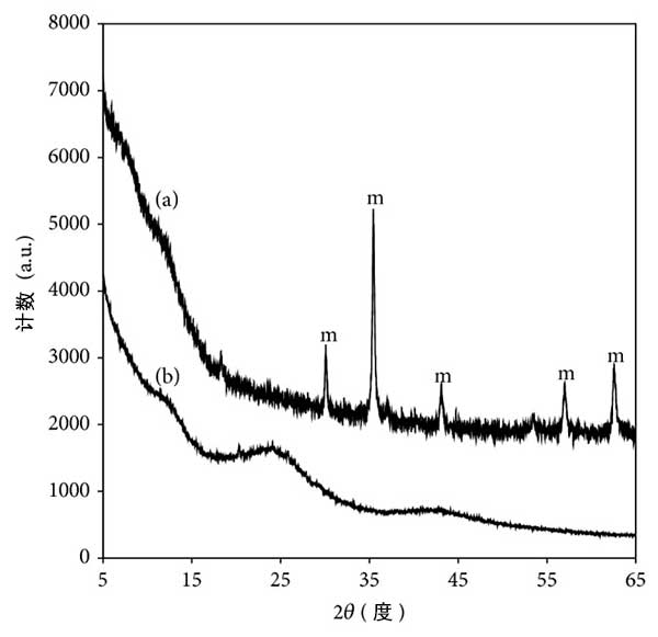 圖1:(a)磁性改性活性炭載體和(b)活性炭的衍射圖。