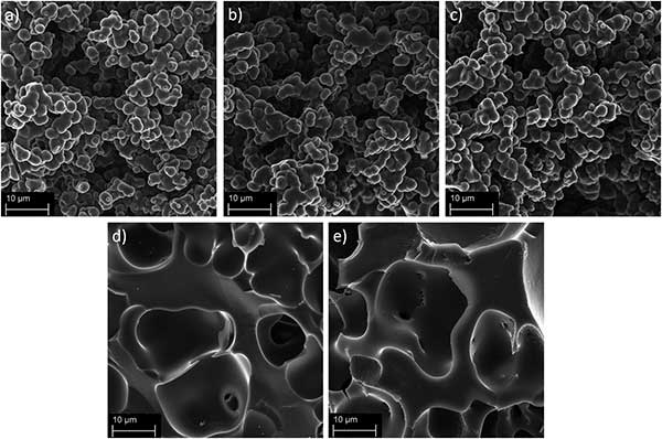 通過掃描電子顯微鏡對高比表面積活性炭進行表征于圖2a-c中?梢钥闯龅氖沁@幾種活性炭具有它是由球形碳顆粒的尺寸與周圍3μm的孔隙網(wǎng)絡(luò)結(jié)構(gòu),這是典型的基于甲醛樹脂活性炭。球形活性炭納米顆粒的燒結(jié)導(dǎo)致孔隙網(wǎng)絡(luò)內(nèi)的空腔,其在直徑為2至20μm的形成;钚蕴勘砻媸枪饣,沒有燒結(jié)的球形活性炭納米顆粒,而它們?nèi)匀辉诰W(wǎng)絡(luò)內(nèi)具有相似直徑的空腔。由于在化學(xué)活化之前低的預(yù)碳化溫度,球形納米顆粒在活化過程中強烈聚集,這導(dǎo)致如前所述的較不剛性的孔隙網(wǎng)絡(luò)。