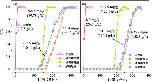 活性炭對甲苯的穿透曲線以及吸附容量如圖2所示。沒摻氮的活性炭表現(xiàn)出較差的甲苯吸附性能,吸附容量分別為6.5和8.0mg g-1。與摻氮活性炭相比,添加含氮磷酸鹽的活性炭需要更長的時(shí)間才能接近突破并表現(xiàn)出更高的吸附能力。對于在600℃下制備的活性炭,其經(jīng)含氮磷酸鹽處理的活性炭的突破時(shí)間為氨磷酸鹽活性炭>磷酸脲活性炭>聚磷酸銨活性炭,其相應(yīng)的體積吸附容量為144.0,104.0和89.8g L-1,質(zhì)量吸附容量分別為296.4,175.9和245.8 mg g-1,分別。與600℃相比,900℃制備的活性炭具有更高的甲苯吸收量,體積吸附容量為122.5-164.5g L -1,質(zhì)量吸附容量為364.1~496.2 mg g-1。值得注意的是,可以看出氨磷酸鹽處理的活性炭具有較高的質(zhì)量吸附能力,而磷酸脲處理的活性炭具有較高的體積吸附能力。這可能歸因于它們不同的堆積密度,氨磷酸鹽具有比磷酸脲更高的堆積密度。