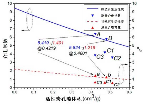 該研究為連接復(fù)介電常數(shù)和活性炭孔容提供了橋梁。此外,它能輔助活性炭達(dá)到快速表征提供了一種方便的方法。在未來(lái)的研究中,我們將嘗試在推導(dǎo)過(guò)程中考慮微波因子,并研究活性炭d介電常數(shù)和孔徑分布或不同吸收性(孔隙率)之間的關(guān)系。
