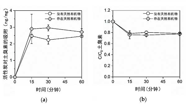 圖1:(a)吸附的土臭素的量和(b)在沒有和存在天然有機(jī)物質(zhì)的情況下活性炭上殘留的土臭素的比例。