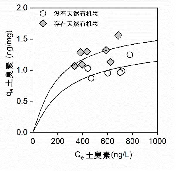 吸附平衡實(shí)驗(yàn)進(jìn)行60分鐘,這足以根據(jù)動(dòng)力學(xué)研究達(dá)到吸附平衡。圖3顯示了在不存在和存在天然有機(jī)物質(zhì)的情況下土臭素在活性炭上的吸附等溫線。如圖2所示,在天然有機(jī)物質(zhì)存在下,吸附的土臭素的總量增加。這些結(jié)果意味著天然有機(jī)物質(zhì)可以增加活性炭的吸附位點(diǎn)。帶負(fù)電荷的天然有機(jī)物質(zhì)增加,因?yàn)殡娕懦饬,從而增加了活性炭吸附能力?/p>