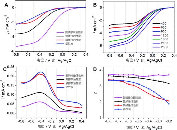 活性炭樣品通過(guò)兩步法制備,包括原位氧化聚合和高溫?zé)峤。這里,苯胺和植酸分別用作氮源和磷源。為了研究氮磷碳比對(duì)活性炭的氧化還原電催化活性的影響,在中性介質(zhì)中進(jìn)行循環(huán)伏安圖。旋轉(zhuǎn)圓盤電極伏安圖在氧飽和的50mM磷酸鹽緩沖溶液中進(jìn)行,結(jié)果顯示在圖2A中。在摻雜碳改性后,活性炭基催化劑的起始電位顯示出從0V到+0.22V的大的正向偏移,氧化還原電流密度也大大增加。此外,由共摻雜碳改性的活性炭電催化活性優(yōu)于由單摻雜碳改性的活性炭電催化活性。在進(jìn)行旋轉(zhuǎn)環(huán)盤電極測(cè)量以研究不同催化劑的過(guò)氧化氫的產(chǎn)生(圖2C)。正如預(yù)期的那樣,氮磷摻雜活性炭顯示出比其他催化劑更低的過(guò)氧化氫產(chǎn)生。可以看出,氮磷摻雜活性炭在氧化還原起始電位和高電流電流方面對(duì)氧化還原具有優(yōu)異的電催化活性,突出了N,P共摻雜和中孔結(jié)構(gòu)對(duì)氧化還原的重要性。