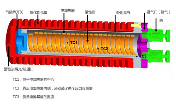 排出壓力約為3.5MPa的實(shí)驗(yàn)結(jié)果如圖4所示。250秒后,加熱功率為500W,中心溫度超過476℃,而電池底座溫度則為76℃。然而,將電池達(dá)到其穩(wěn)態(tài)溫度分布需要大約60分鐘,其中電池基座中的溫度為166℃;钚蕴康臏囟炔辉试S超過526℃。 60分鐘,加熱功率逐漸降低,以保持最高溫度低于526℃,壓力高于3.5MPa。由于電池基座的溫升速率隨時(shí)間降低,輸送的氮量也減少了。因此,在15分鐘后結(jié)束放電階段僅從活性炭吸附池釋放4.6g氮。圖4中的冷卻階段持續(xù)約100分鐘,并且如果放電階段在15分鐘后結(jié)束(此時(shí)基礎(chǔ)溫度僅為126℃),則可以減少冷卻階段;钚蕴恐械募訜岷屠鋮s速率以及溫度分布與數(shù)值分析估計(jì)的相似。這表明簡化的數(shù)值傳熱分析為吸附池中的傳熱提供了令人滿意的估計(jì)。