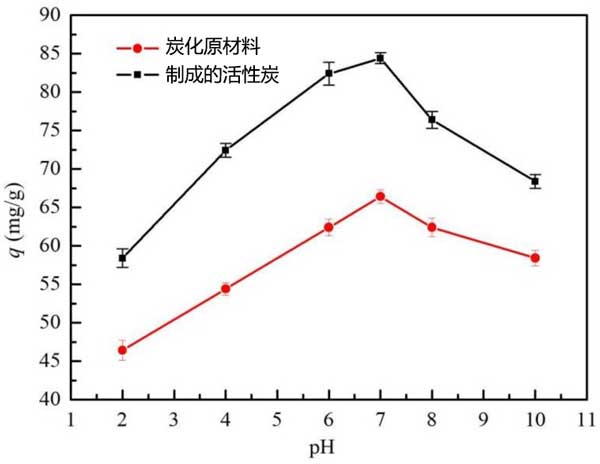 pH值的影響:吸附研究中最重要的因素之一是培養(yǎng)基pH的影響。根據(jù)吸附劑的用途,不同的物質表現(xiàn)出不同的pH范圍。pH值對活性炭平衡吸附柴油的影響如圖3所示。當吸附劑的pH值從2增加到10時,吸附劑用量,吸附劑溫度和接觸時間分別為0.2g,30℃和240秒。在酸性條件下,發(fā)現(xiàn)吸附容量隨pH增加而增加。當pH為7時,吸附容量達到最大值。當pH值繼續(xù)升高并且溶液系統(tǒng)變?yōu)閴A性時,吸附容量下降。這些結果表明,堿性和酸性環(huán)境不適合生物炭的吸附過程,活性炭吸附柴油的最佳pH值為7。這種變化可通過溶液中質子數(shù)量的變化來解釋。和油乳液的穩(wěn)定性。強烈的酸性導致油脂聚結,隨后增加油滴的大小。由于初始pH>7,由于酸性物質的存在,柴油的溶解度增加,這使得柴油難以吸附在活性炭上。隨著初始pH的增加,過量的羥基離子和柴油競爭溶液中的活性吸附位點。