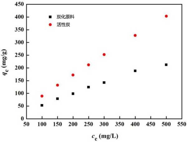吸附等溫線:吸附等溫線對于描述溶質如何與吸附劑相互作用非常重要,并且對于優(yōu)化吸附劑的使用至關重要。Langmuir等溫線假定單層吸附在含有均勻策略和吸附的有限數(shù)量的吸附位點的表面上,而在表面平面內沒有吸附物的遷移。圖4顯示了柴油在所制備活性炭上的平衡吸附等溫線。從圖中可以看出,與炭化原料相比,活性炭的吸附等溫線更接近直線。隨著柴油溶液濃度的增加,活性炭對柴油溶液的吸附能力不斷增加。當柴油濃度為500 mg/L時,活性炭達到最大吸附量。然而,當柴油溶液濃度達到400 mg/L時,炭化原料的吸附容量增加緩慢。可能是柴油顆粒覆蓋了材料的表面,導致吸附速率降低。從圖4中可以清楚地看出,活性炭的吸附能力明顯強于炭化原料。