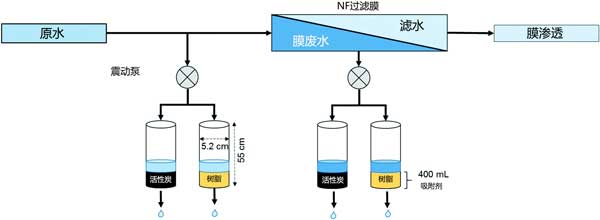 使用的納濾膜是螺旋纏繞膜。處理系列由30μm聚丙烯過濾器,帶防垢劑注入的給水泵和兩個(gè)串聯(lián)的NF膜組成。給水流量以78%的滲透物回收率為目標(biāo)。由于來自輸送管道的錳顆粒導(dǎo)致預(yù)濾器的部分堵塞導(dǎo)致需要更換過濾器七次,這導(dǎo)致進(jìn)料壓力略低,并且滲透物中全氟烷基物質(zhì)的濃度略高于平均值。原水是城市的地下水,這是一個(gè)受全氟烷基物質(zhì)污染的地下水井場。每周一次采集原水,滲透水和廢水的樣品,為期35周。使用活性炭和陰離子交換樹脂吸附柱進(jìn)一步處理原水和廢水(圖1)。