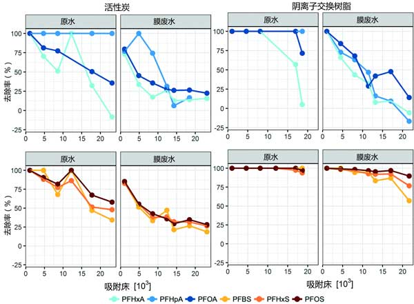 實(shí)驗(yàn)總計(jì)進(jìn)行了12周,每兩周取樣。這導(dǎo)致所有活性炭色譜柱的實(shí)驗(yàn)運(yùn)行時(shí)間為24個(gè),分別處理原水和膜廢水的陰離子交換樹脂色譜柱。在每次采樣之后每周對所有柱進(jìn)行反洗,以模擬典型的全尺寸操作?偣卜治隽15種全氟烷基物質(zhì),將吸附材料相對于全氟烷基物質(zhì)去除的性能與柱吸附模型的性能進(jìn)行了比較。