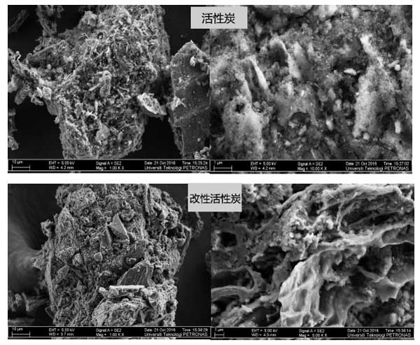 原始和改性活性炭的形態(tài)行為總結(jié)在圖2中。兩種不同的放大倍數(shù)(10μm和1μm)用于檢測官能化前后的表面形態(tài)。很明顯,活性炭在官能化之前由不規(guī)則的異質(zhì)表面組成。在用離子液體進(jìn)行表面改性后,沒有觀察到對結(jié)構(gòu)的明顯損壞。表面粗糙度從離子液體處理逐漸得到改善,離子液體處理與引入含氧官能團(tuán)有關(guān)。此外,通過在官能化后在結(jié)構(gòu)中引入小的和更大的孔,已經(jīng)批準(zhǔn)了活性炭的無定形性質(zhì)。據(jù)信這些微球是高比表面積和總孔體積的原因。改性活性炭在其結(jié)構(gòu)中顯示出更多的孔隙,這意味著除了制備方法之外,活性炭的形態(tài)很大程度上取決于所用的氧化劑。