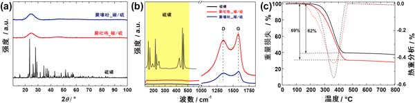 圖3:硫聚吡咯活化的分級碳硫和聚噻吩活化的分級碳硫復合物的XRD衍射圖和拉曼光譜。