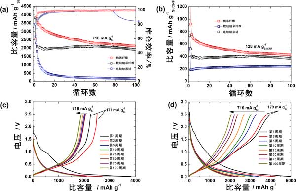 如圖4所示,從第一個循環(huán)的電壓分布中看出,兩個陽極的第一個循環(huán)的額外貢獻來自不可逆的固體電解質(zhì)界面層形成和電解質(zhì)分解。對于電化學表征,在紐扣電池配置中使用鋰金屬作為對電極對所有硅陽極進行恒電流充電和放電。裸露的十億分之一硅陽極在第一個循環(huán)中提供3445mAhg的放電容量,庫侖效率約為65%。從第二個循環(huán)開始,二氧化硅的硅載納米纖維陰極的比容量值急劇下降至2600mAhg,而納米纖維的靜電紡絲陽極顯示出邊際下降,比容量為4000mAhg-1,庫侖效率均為約91%。比容量的急劇下降可歸因于二氧化硅的硅載納米纖維中的二氧化硅殼在第一次循環(huán)中不可逆鋰化。