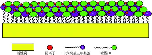 用表面活性劑改性的活性炭在電吸附過程中具有潛在的應(yīng)用,其中表面電荷和潤濕性起重要作用。用離子表面活性劑功能化的活性炭電極最近在電容去離子技術(shù),特別是反向電容去離子系統(tǒng)中引起了相當(dāng)大的關(guān)注。圖3表明在用吐溫80和HDTMA的二元混合物改性的活性炭上吸附陰離子。吐溫80的存在表明HDTMA的吸附密度增強(qiáng),完美填充(高穩(wěn)定性),這在電吸附過程中都是值得的。實際上,HDTMA的增強(qiáng)的吸附密度誘導(dǎo)了陰離子污染物的高吸附能力。此外,改進(jìn)的填料賦予表面活性劑在表面上的穩(wěn)定性。這些特殊效果是混合表面活性劑體系應(yīng)用的最終目標(biāo)之一,為了提高活性炭的表面活性,對于單一表面活性劑體系來說,這是不可能發(fā)生的。