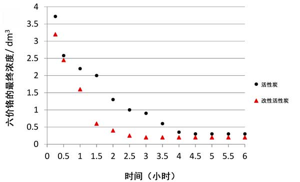 從獲得的測(cè)試結(jié)果可以得出結(jié)論,吸附時(shí)間對(duì)特定碳的鉻(VI)去除效率具有顯著影響。鉻酸根離子相對(duì)于活性炭的最大還原發(fā)生在4.5小時(shí)后。在硝酸改性活性炭上去除鉻的速率更高,并且在2.5 h后發(fā)生了吸附平衡時(shí)間。然后進(jìn)行穩(wěn)定化處理,并進(jìn)行進(jìn)一步測(cè)試(確定等溫線),發(fā)現(xiàn)該接觸時(shí)間為不同的活性炭通常不超過6小時(shí)。