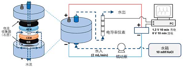 方案1中描述了用于檢查脫鹽性能的膜電容去離子系統(tǒng)。每個(gè)電極由作為集電器的石墨,交流電極和IEM組成。將陰離子交換膜和陽(yáng)離子交換膜分別放在陽(yáng)極和陰極上。一對(duì)電極由厚度為110 µm的尼龍墊片隔開。使用蠕動(dòng)泵將進(jìn)料水供應(yīng)到電解池。處理后的溶液直接流過(guò)電導(dǎo)率儀,隨后使用單程模式。除了IEM的存在外,還以與電容去離子中使用的相同配置進(jìn)行了CDI實(shí)驗(yàn)。使用電池循環(huán)器在1點(diǎn)分別施加電壓10分鐘。在充電步驟中為2 V,在放電步驟中為0V。從第三個(gè)循環(huán)獲得數(shù)據(jù),并從至少三個(gè)操作中計(jì)算出平均值,以實(shí)現(xiàn)可重復(fù)性。