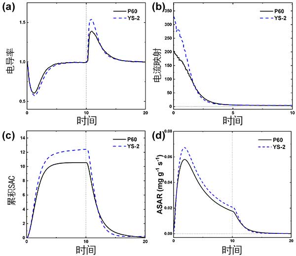圖2以(a)歸一化電導(dǎo)率曲線表示使用疏水和親水活性炭電極的電容去離子性能。如圖2a所示,在充電步驟期間,與疏水活性炭電極相比,歸一化電導(dǎo)率在親水活性炭電極的情況下顯示出更低和更寬的下降。對(duì)于親水活性炭電極,在充電步驟開始時(shí),圖2b中所示的特定電流也顯得較高。圖2的a,b在電容去離子表明更多離子在充電步驟中的初始幾分鐘吸附在親水活性炭電極的表面上。這意味著在親水活性炭電極上可以更快,更高地吸附鹽?梢酝茢啵捎谒肿痈菀走M(jìn)入微孔,因此親水活性炭電極上離子的可及表面積大于疏水活性炭電極上的離子的可及表面積。