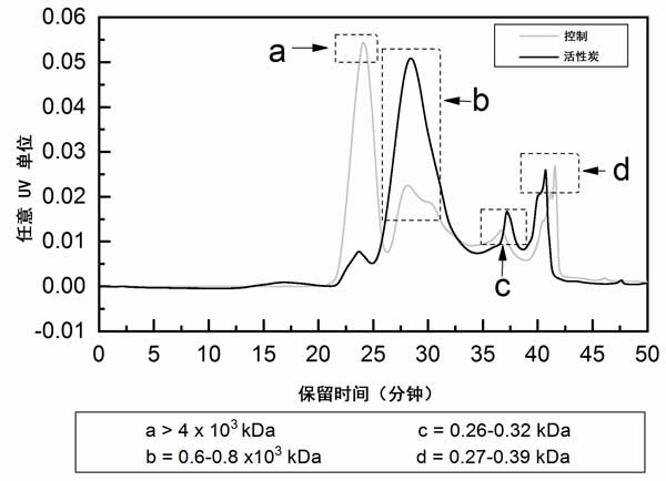 為了檢驗(yàn)活性炭改變可溶性微生物組成,使其對膜具有更高的親和力這一假設(shè),通過GPC分析了構(gòu)成可溶性微生物的有機(jī)分子的大小分布(圖1)。在第二次可溶性微生物運(yùn)行結(jié)束時(shí)收集了可溶性微生物樣品(圖1b),有趣的是,GPC色譜圖顯示了對照反應(yīng)堆和活性炭加入反應(yīng)堆之間的明顯差異。在活性炭反應(yīng)器的可溶性微生物中,保留時(shí)間為24分鐘時(shí),來自對照反應(yīng)器的可溶性微生物的第一個(gè)峰顯著降低,而在活性炭反應(yīng)器的可溶性微生物中,在28分鐘時(shí)觀察到峰的上升(圖1,分別是峰值a和b);钚蕴糠磻(yīng)器的可溶性微生物中的37分鐘處的峰也升高(峰c)?扇苄晕⑸镏心承┯袡C(jī)化合物含量的變化(升高或降低)可能歸因于,由于微生物群落組成的變化或某些活性炭所觀察到的代謝活性增強(qiáng),導(dǎo)致某些微生物產(chǎn)品的產(chǎn)生和分泌增加另外,或抑制進(jìn)水橄欖油廢水中物質(zhì)的降解。有機(jī)化合物對活性炭顆粒的吸附只會降低其在可溶性微生物中的外觀。由于吸附到活性炭上,可溶性微生物中某些成分的減少(如峰a所示)也有可能優(yōu)先吸附其他成分,這些成分對通量的減少更不利,或者起膜調(diào)節(jié)前體的作用,這可能會增強(qiáng)生物膜的生長(例如峰b–d)。顯然,確定膜上有機(jī)污染物的身份是一項(xiàng)必不可少的任務(wù),目前,尚不清楚不同可溶性微生物組分對膜污染的詳細(xì)影響以及它們被活性炭的吸附。
