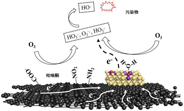 負(fù)載鈰的活性炭在臭氧氧化中可以很好的去除有機(jī)物,這主要是由于其各種去除機(jī)理,包括吸附,臭氧氧化和自由基氧化。吸附和臭氧化都是選擇性的。一些有機(jī)物在活性炭上緩慢吸附,因此非選擇性的羥基自由基氧化對(duì)于通過負(fù)載鈰的活性炭催化的臭氧氧化作用從水中去除難處理的有機(jī)化合物起著重要的作用。催化臭氧化系統(tǒng)中生成·OH的可能機(jī)理如圖3所示。通過這種機(jī)制,不僅可以通過表面官能團(tuán)而且可以通過負(fù)載在活性炭上的鈰來刺激·OH的生成。由表面基團(tuán)的自由基激發(fā)依靠其堿度和給電子效應(yīng)。對(duì)于負(fù)載在活性炭上的鈰,氧化鈰表面的氧空位是催化活性位。ø 3可以具有氧空位或直接用H反應(yīng)2 ö將其吸附在氧空位,以產(chǎn)生HO 3·,·O2 2-,HO 2·等自由基。這些自由基可以通過一系列鏈反應(yīng)轉(zhuǎn)化為·OH。在自由基生成過程中,氧空位周圍的Ce 3+會(huì)失去電子,并被氧化為Ce 4+,這可能導(dǎo)致催化活性降低。因此,富電子結(jié)構(gòu)(例如石墨烯層,-NO 2和吡喃酮)與氧化鈰之間可能發(fā)生電子轉(zhuǎn)移過程,從而導(dǎo)致Ce 4+的還原和催化活性的更新。這種協(xié)同效應(yīng)可能是在負(fù)載鈰的活性炭表面快速連續(xù)產(chǎn)生·OH的關(guān)鍵。