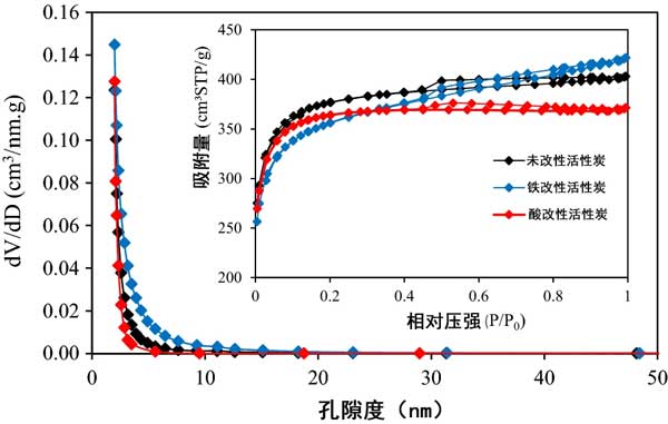 圖1顯示了活性炭纖維的孔徑分布。如圖1所示,活性炭纖維的孔徑在1至20nm之間。同時(shí),幾種活性炭的所有氮吸附/解吸曲線均與IV型吸附等溫線相對應(yīng)。由于活性炭內(nèi)中孔定義為2–50 nm,在未經(jīng)改性和經(jīng)過改性的活性炭是微孔的,但HNO 3改性擴(kuò)大了孔的結(jié)構(gòu)并導(dǎo)致了中孔的結(jié)構(gòu)。因此,活性炭顯示出微孔/中孔結(jié)構(gòu)特征,并且可以用作在水中吸附砷離子的有前途的材料。