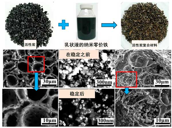 將nZVI的乳液與十二烷基苯磺酸鈉和無水乙醇混合,并在氮?dú)獗Wo(hù)下在機(jī)械分散器中分散12小時(shí)。分散后,依次將100 mL乳液,200 g 活性炭和200 mL去離子水添加到1000 mL錐形燒瓶中,并在水平振動(dòng)器上以240 rpm的速度震蕩。震蕩12小時(shí)后,用去離子水清洗混合物,并在真空干燥箱中于45°C干燥過夜獲得。