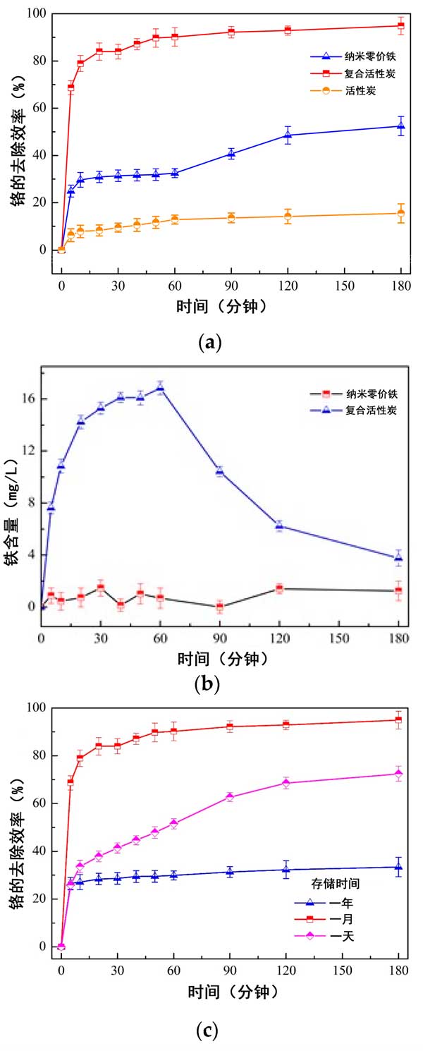 圖3:使用不同材料的總鉻的比較去除效率。(a)活性炭,nZVI和復(fù)合材料;(b)溶液中鐵含量的變化;(c)活性炭復(fù)合材料具有不同的存儲(chǔ)時(shí)間。