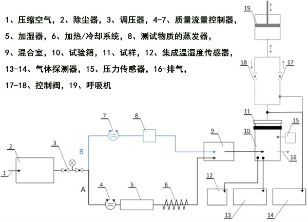 在測(cè)試過程中,干燥的壓縮空氣通過裝有減壓器的顆粒過濾器輸送到系統(tǒng)中,該壓力過濾器的調(diào)節(jié)范圍為0-8 bar。然后將其分為兩條線(圖2):用于溫度和相對(duì)濕度調(diào)節(jié)的線A和用于調(diào)節(jié)測(cè)試室內(nèi)測(cè)試物質(zhì)濃度的線B。將來自管線A的給定溫度和相對(duì)濕度的空氣與來自管線B的激發(fā)蒸汽在混合室中混合,然后將活性炭鎖定在直徑為11.3的氣動(dòng)樣品架中,并將其引入測(cè)試室。另外,在脈動(dòng)流測(cè)試期間使用了連接到測(cè)試室出口的呼吸機(jī)。呼吸機(jī)設(shè)定為25個(gè)循環(huán)/分鐘和2 L/沖程,這對(duì)應(yīng)于每分鐘25吸氣和25呼氣,呼吸量為2L。呼吸機(jī)的氣流模式為正弦曲線。脈動(dòng)流量測(cè)試期間的挑戰(zhàn)濃度得到補(bǔ)償,以確保將總負(fù)載標(biāo)準(zhǔn)化為穩(wěn)態(tài)流量條件。實(shí)驗(yàn)以四個(gè)變體進(jìn)行,每個(gè)變體評(píng)估不同因素(即挑戰(zhàn)濃度,相對(duì)濕度,挑戰(zhàn)流速,挑戰(zhàn)流型)對(duì)活性炭復(fù)合材料吸附特性的影響。