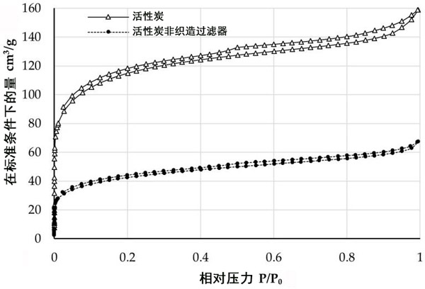 活性炭和負(fù)載活性炭的非織造過濾器的氮吸附(下部分支)/脫附(上部分支)等溫線如圖3所示。