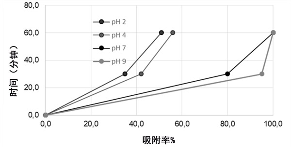 研究了pH值對三甲胺在活性炭上吸附的影響。在該過程中,發(fā)生吸附現(xiàn)象的溶液的pH值是非常重要的參數(shù),尤其是在三甲胺為布朗斯臺(tái)德堿的情況下。在官能團(tuán)和吸附劑表面之間產(chǎn)生的靜電荷的大小主要取決于介質(zhì)的pH。在pH值為2、4、7和9的情況下,用0.200g的活性炭測量了在0、30和60分鐘時(shí)三甲胺的吸附百分比,結(jié)果總結(jié)在圖3中。