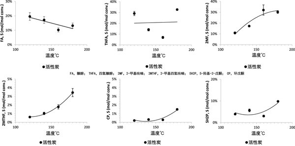 由于使用活性炭整料進(jìn)行糠醛連續(xù)氫化以合成糠醇,四氫糠醇和環(huán)戊酮的工作很少,我們希望確定溫度和壓力對(duì)選擇性和時(shí)空產(chǎn)率或轉(zhuǎn)化率的影響。因此,在一組實(shí)驗(yàn)中,采用活性炭催化劑來(lái)確定溫度對(duì)糠醛氫化的影響。在所有溫度下,活性炭整料的糠醛轉(zhuǎn)化率均高于90%。活性炭整料的高碳封閉率是在180°C時(shí)達(dá)到的(約90%)。升高溫度會(huì)降低糠醇的選擇性,并提高除四氫糠醇以外的所有產(chǎn)品的選擇性(圖2)。