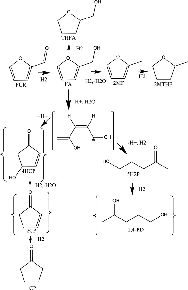 在下一組實(shí)驗(yàn)中,確定了液體停留時(shí)間對(duì)糠醛加氫超過(guò)0.8%活性炭催化劑的影響(H 2氣流保持恒定在100 mL/min)?啡┺D(zhuǎn)化率隨著液時(shí)空速的增加或停留時(shí)間的縮短而下降,碳封閉率在74%至100%之間。溫度,壓力和液體停留時(shí)間效應(yīng)研究的結(jié)果表明,活性炭催化劑主要通過(guò)糠醛促進(jìn)了糠醛中糠醇和2-甲基呋喃的形成,并通過(guò)推測(cè)性反應(yīng)途徑促進(jìn)了環(huán)戊酮和5-羥基-2-戊酮的少量形成,需要對(duì)酮進(jìn)行酸催化)形成(圖3)。