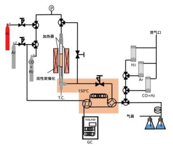 甲醇合成后,將活性炭催化劑插入連續(xù)的管狀固定床反應器中(圖1.)。在將工作條件調(diào)節(jié)至壓力14-20 bar和溫度220°C的條件下測試穩(wěn)定性。在管式反應器中總共填充1-2克活性炭。在反應步驟之前,在操作溫度下用H 2流還原催化劑。使用機器生成的甲醇分析氣體為了防止催化劑液化,活性炭催化劑層后的管道保持在150°C。