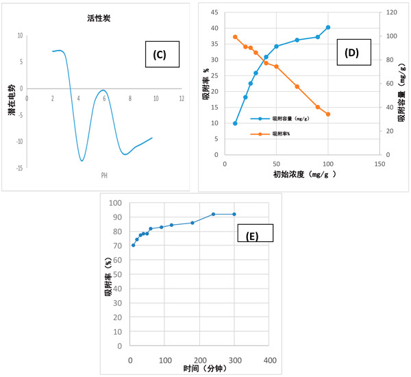 初始濃度為10-100 µg/mL可以提高初始濃度。如圖1D所示,在將乙酰胺的初始濃度從10 mg/L更改為100 mg/L時,吸附容量從9.94 mg/g增加到36.31 mg/g,去除效率從99.37%降低到40.275%。這些結(jié)果表明,活性炭對乙酰胺類的吸附取決于初始濃度。