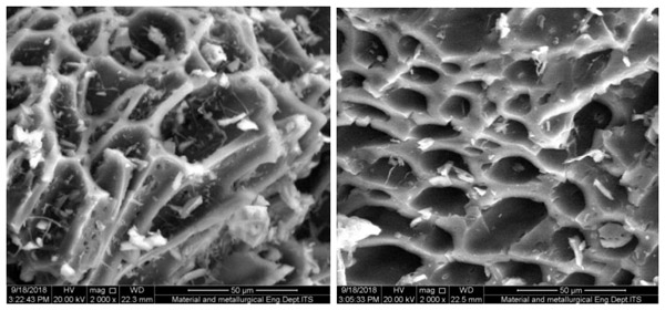 通常,由碳化過程形成的活性炭具有粗糙的表面結(jié)構(gòu),其孔徑不會太大以至于會影響吸附能力(圖1)。粒度和表面積對吸附劑很重要,因?yàn)榱6葧绊懳侥芰ΑS稍搱D可知,通過RSS碳化處理得到的活性炭的孔徑為40μm左右,未改性,使用活化液進(jìn)行改性后,為<20μm。這表明,活化液的浸漬在孔的形成中起著重要的作用。促進(jìn)更多的孔隙形成?偙砻娣e影響總吸附容量,從而提高吸附劑去除廢水中有機(jī)化合物的效率。