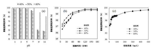 圖2:(a)pH(b)接觸時(shí)間和(c)在不同的活化劑濃度下初始濃度對(duì)萘酚藍(lán)黑吸收的影響。