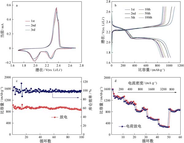 為了評估活性炭作為陰極的電化學性能,將鋰箔作為陽極組裝到鋰硫電池的紐扣電池中。用于第一,第二和第三個循環(huán)的循環(huán)伏安圖(CV)曲線上在0.05毫伏·秒的掃描速率的電位窗口進行(圖2A)。在第一循環(huán)期間,觀察到兩個陰極峰在2.26和1.97 V,CV曲線中最初的幾個循環(huán)幾乎重疊,這表明循環(huán)穩(wěn)定性極佳,容量保持率相對較高。活性炭的恒電流充電/放電曲線和循環(huán)穩(wěn)定性的測試中,如在圖中所描述2B、C;钚蕴侩姌O的首次放電容量為1045 mAh·g -1,約為硫理論容量的62.5%。此外,活性炭電極在第100次循環(huán)時也顯示出869.8mAh·g -1的放電容量。如圖2d所示測量活性炭的倍率性能,在200–3200 mA·g -1下表現(xiàn)出1260、1050、806、513、290 mAh·g -1的可逆放電容量。此外,當電流密度達到800 mA·g時,活性炭陰極的放電容量為802 mAh·g -1。多孔活性炭材料表現(xiàn)出中等的鋰硫電池電化學性能,顯示出高性能鋰硫電池的潛力。