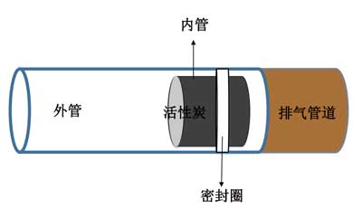 模擬的測試環(huán)境包含內(nèi)部和外部兩部分的試管進行吸附。外管的長度為50cm,直徑為3.8cm。該管的功能是將排氣消聲器連接至氣體分析儀,而內(nèi)管則用作活性炭的儲存器。改變內(nèi)管的長度,以確定活性炭負載百分比對降低廢氣濃度的影響。直徑分別為3cm,4cm和5cm。管子之間有一個密封,以防止廢氣泄漏。管的結構在圖1中進行了描述。