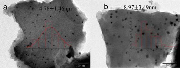 圖1:(a)活性炭載鎳和(b)富氮活性炭載鎳的透射電子顯微鏡圖像。