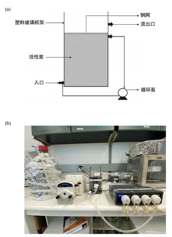 圖1:(a)活性炭的示意圖生物濾池,(b)活性炭生物濾池設置的照片。